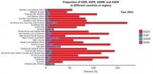 Proportion of EOGC ASIR, ASPR, ASMR, and ASDR in different regions globally in 2021.